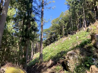 涸れ沢を越えると下草は大分マシになり、何年放置されているのかわからない簡易トイレの奥、